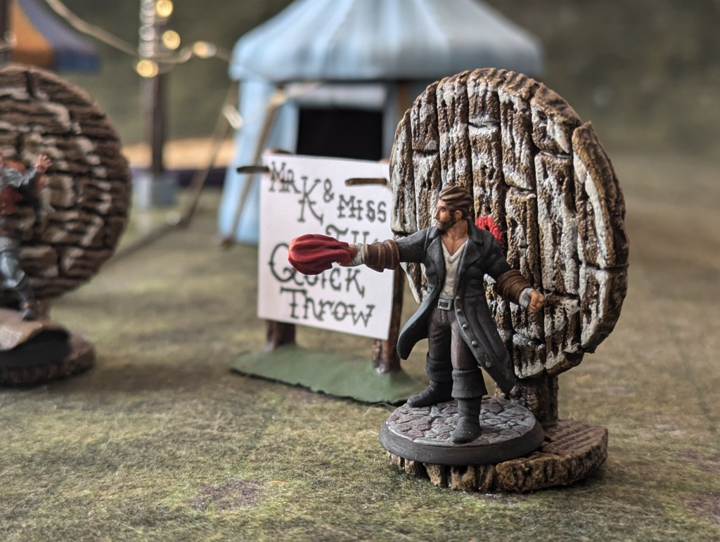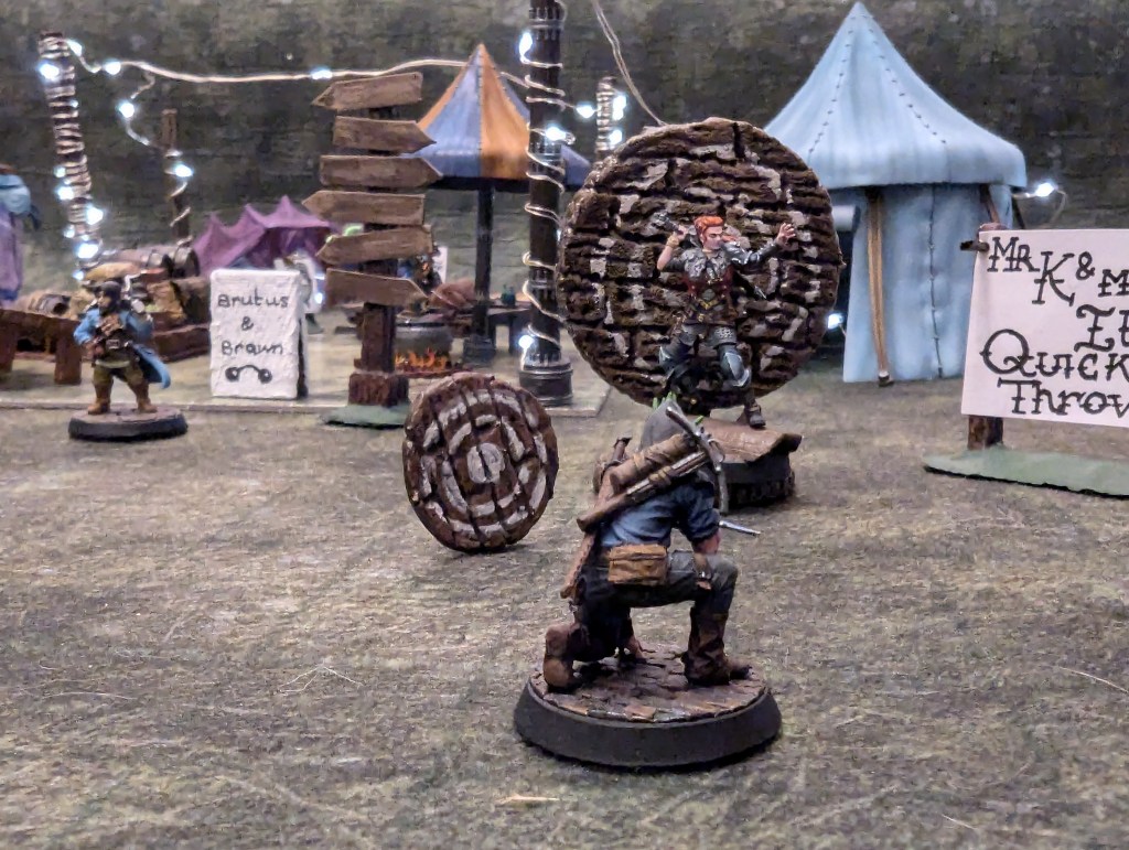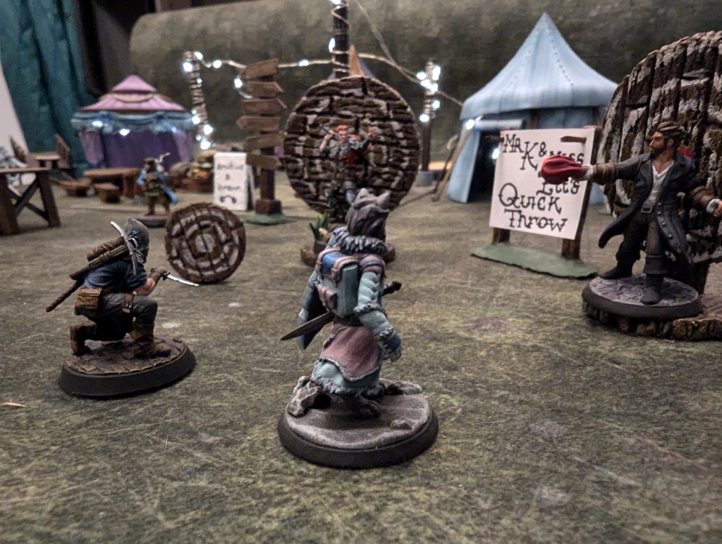 Meanwhile, Caithe and William have a more difficult time with the elf and tabaxi teenages. They follow the crowd into the main tent, seeing a large performance area and bleachers filling up with people. The elvish teen is spotted, crouching down and trying to hide on the other side of the bleachers. Caithe and William try some quick planning and decide to create a ruse with Caithe’s ribbon presented overtly on show, with William attempting to pickpocket the teen. Their plan is foiled when William fails to retrieve the yellow cloth and the elf runs away. Caithe attempts to stop them in their tracks, however unsuspectingly loses her coloured cloth to the small tabaxi watching her from afar.