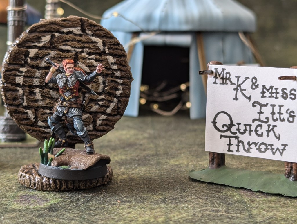 They begin the night by visiting ‘Mr K & Miss Ill’s Quick Throw’, a knife throwing contest. William steps up to throw first with Caithe being the first volunteer. She luckily escapes with just some minor grazes. When William and Caithe switch, however, he is not so lucky. Decker and Ever take double shots on Zagreus, who narrowly escapes two knives to the groin.